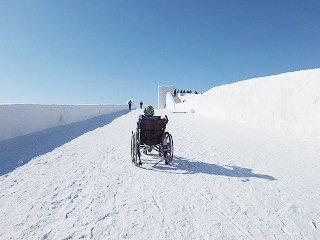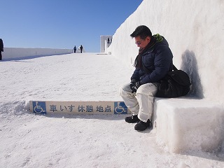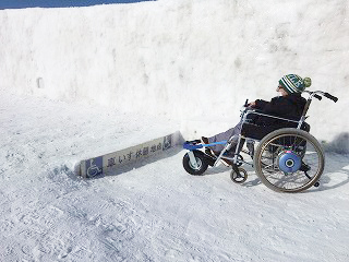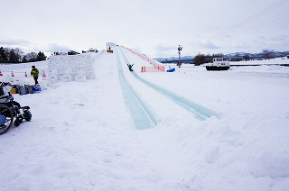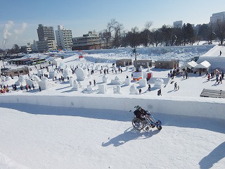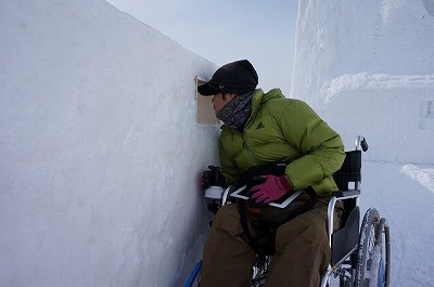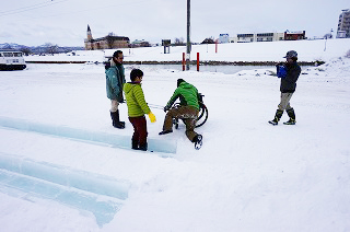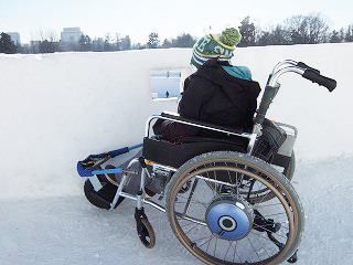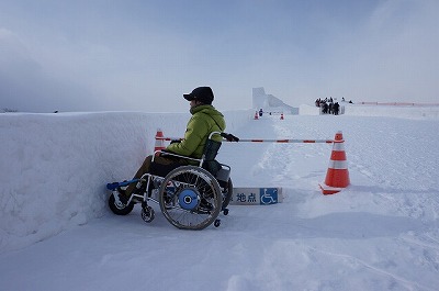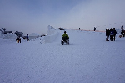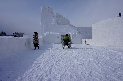 | 一部階段あります。巨大雪像のすべり台 | 車いすから降りることができれば滑れる!! |